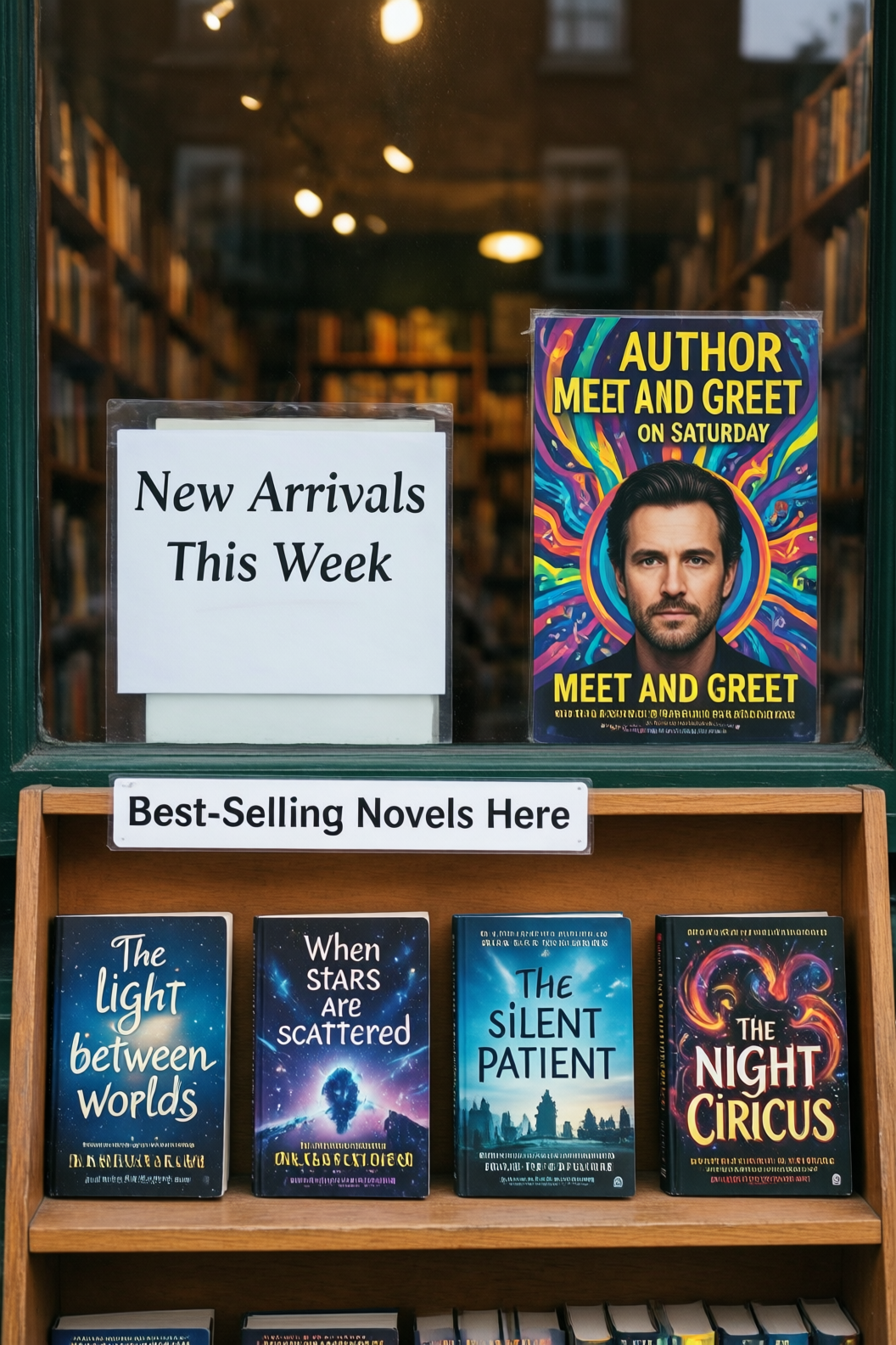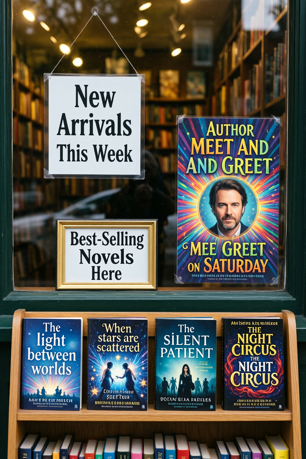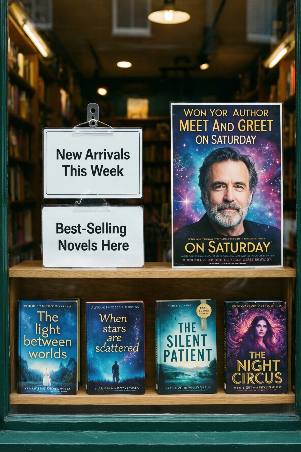 | Bookstore window display. A sign displays “New Arrivals This Week”. Below, a shelf tag with the text “Best-Selling Novels Here”. To the side, a colorful poster advertises “Author Meet And Greet on Saturday” with a central portrait of the author. There are four books on the bookshelf, namely “The light between worlds” “When stars are scattered” “The slient patient” “The night circus” |