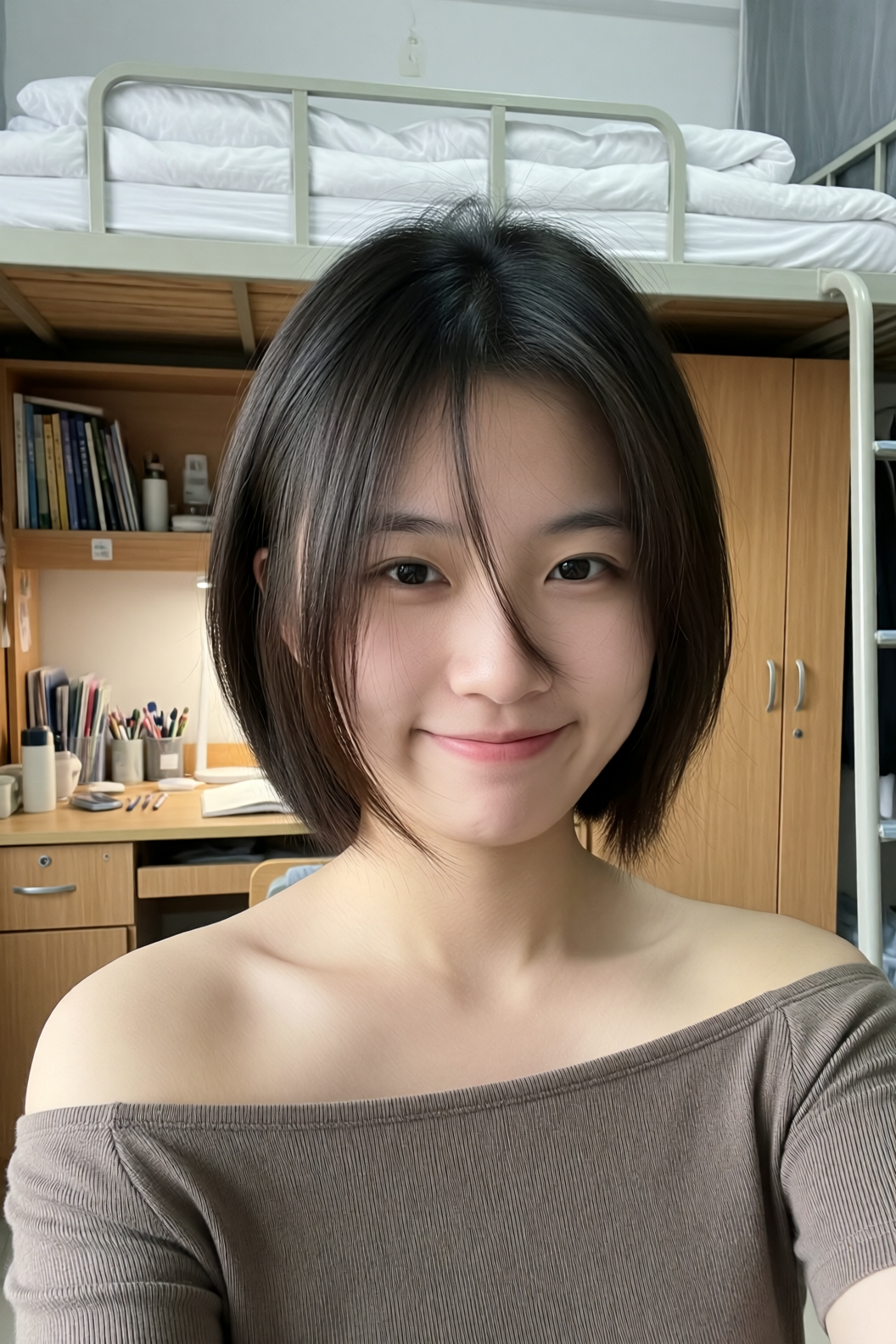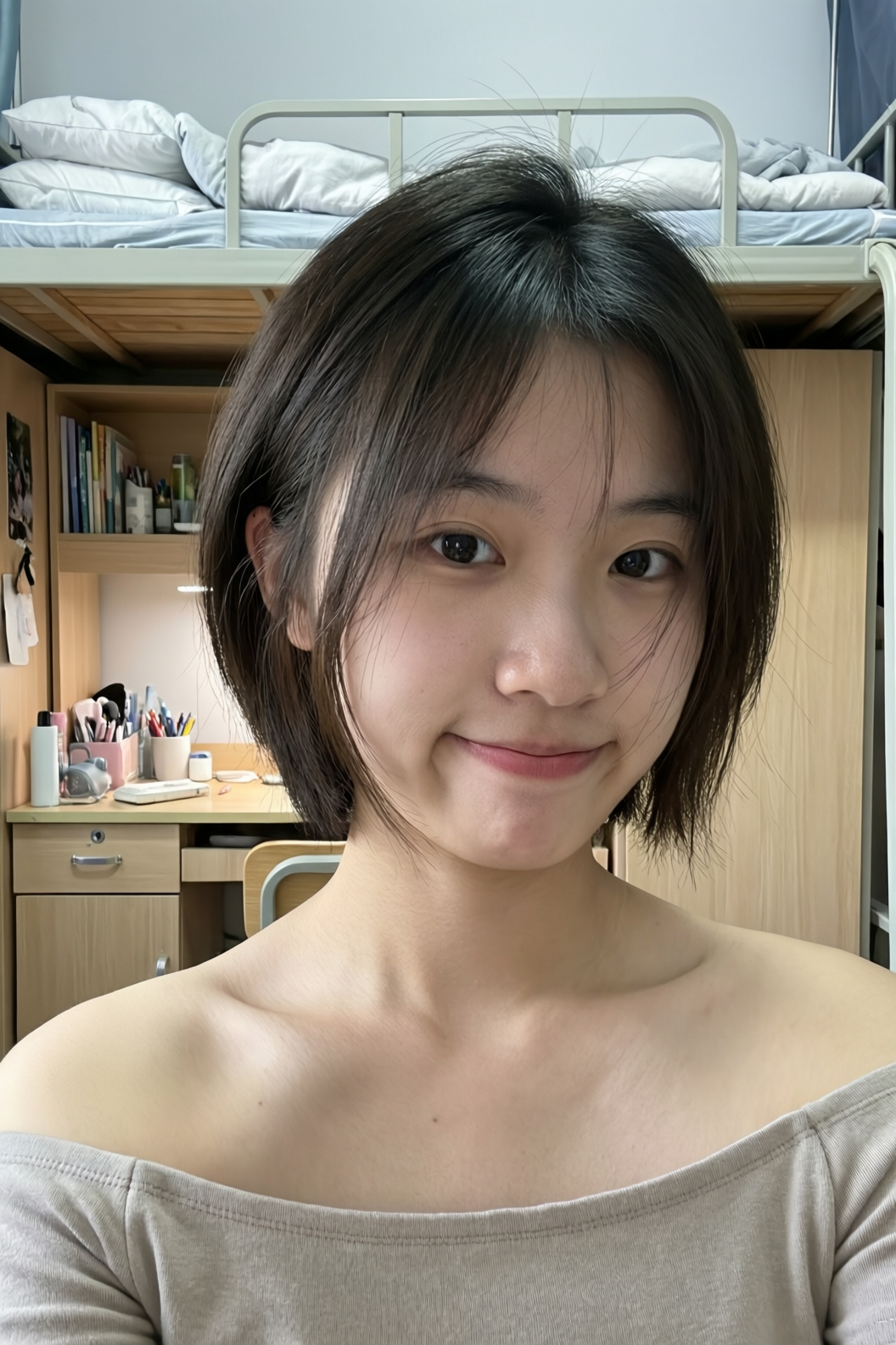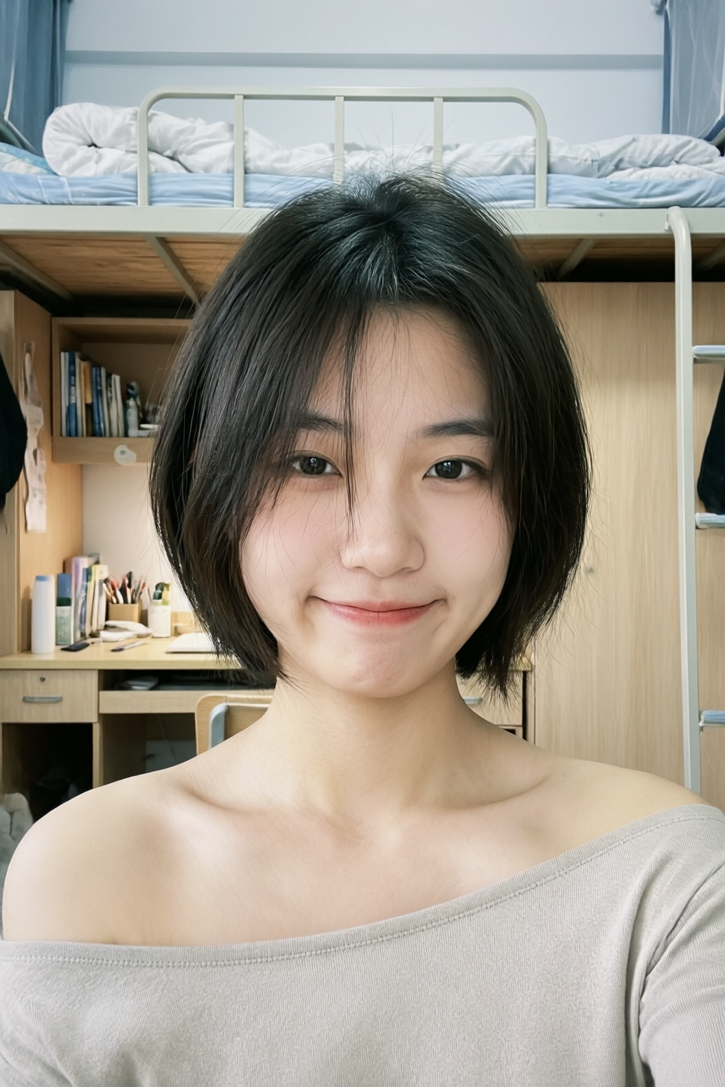 | A Chinese female college student, around 20 years old, with a very short haircut that conveys a gentle, artistic vibe. Her hair naturally falls to partially cover her cheeks, projecting a tomboyish yet charming demeanor. She has cool-toned fair skin and delicate features, with a slightly shy yet subtly confident expression—her mouth crooked in a playful, youthful smirk. She wears an off-shoulder top, revealing one shoulder, with a well-proportioned figure. The image is framed as a close-up selfie: she dominates the foreground, while the background clearly shows her dormitory—a neatly made bed with white linens on the top bunk, a tidy study desk with organized stationery, and wooden cabinets and drawers. The photo is captured on a smartphone under soft, even ambient lighting, with natural tones, high clarity, and a bright, lively atmosphere full of youthful, everyday energy. |