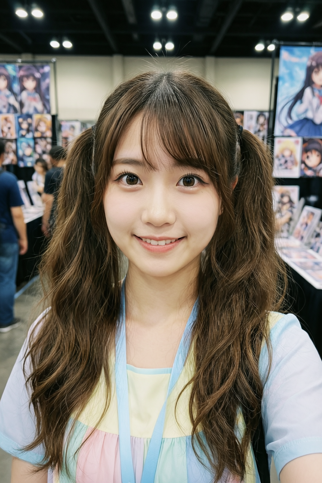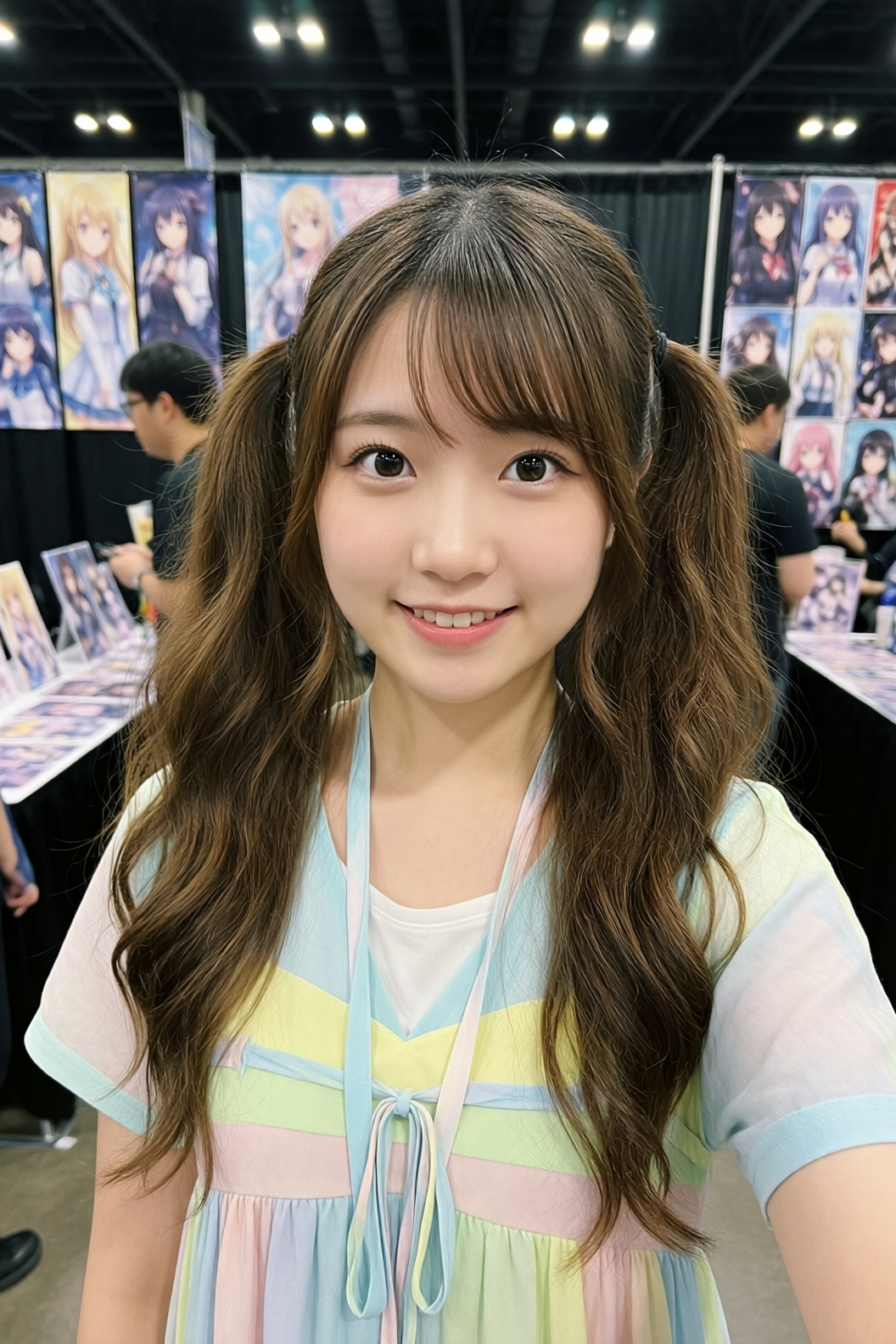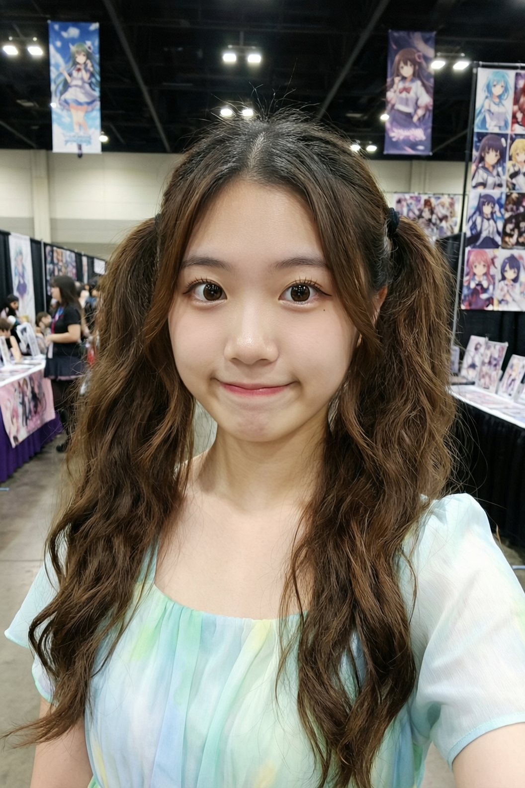 | A 20-year-old East Asian girl with delicate, charming features and large, bright brown eyes—expressive and lively, with a cheerful or subtly smiling expression. Her naturally wavy long hair is either loose or tied in twin ponytails. She has fair skin and light makeup accentuating her youthful freshness. She wears a modern, cute dress or relaxed outfit in bright, soft colors—lightweight fabric, minimalist cut. She stands indoors at an anime convention, surrounded by banners, posters, or stalls. Lighting is typical indoor illumination—no staged lighting—and the image resembles a casual iPhone snapshot: unpretentious composition, yet brimming with vivid, fresh, youthful charm. |