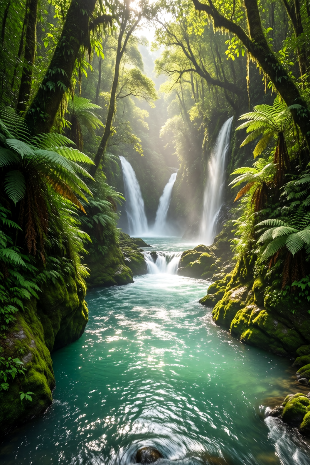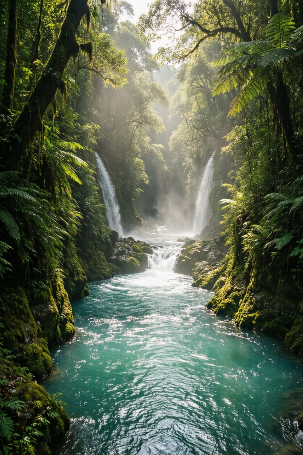 | A turquoise river winds through a lush canyon. Thick moss and dense ferns blanket the rocky walls; multiple waterfalls cascade from above, enveloped in mist. At noon, sunlight filters through the dense canopy, dappling the river surface with shimmering light. The atmosphere is humid and fresh, pulsing with primal jungle vitality. No humans, text, or artificial traces present. |