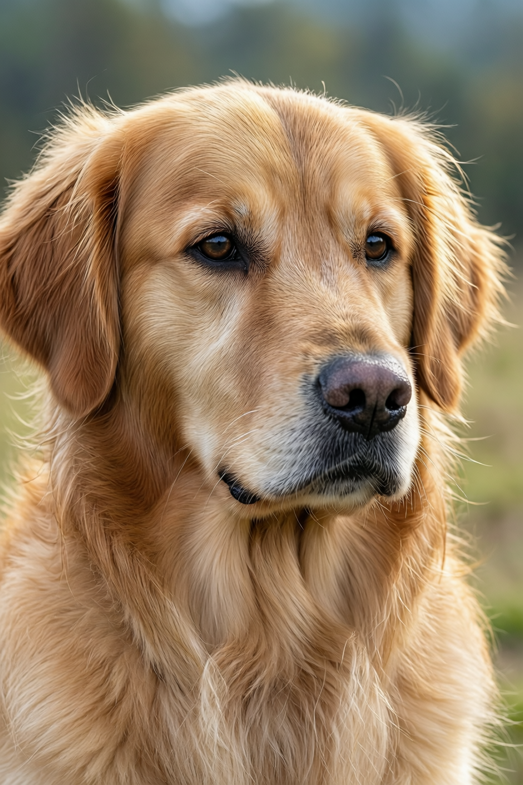 | An ultra-realistic close-up of a golden retriever outdoors under soft daylight. Hair is exquisitely detailed: strands distinct, color transitioning naturally from warm gold to light cream, light glinting delicately at the tips; a gentle breeze adds subtle volume. Undercoat is soft and dense; guard hairs are long and well-defined, with visible layering. Eyes are moist, expressive; nose is slightly damp with fine specular highlights. Background is softly blurred to emphasize the dog’s tangible texture and vivid expression. |