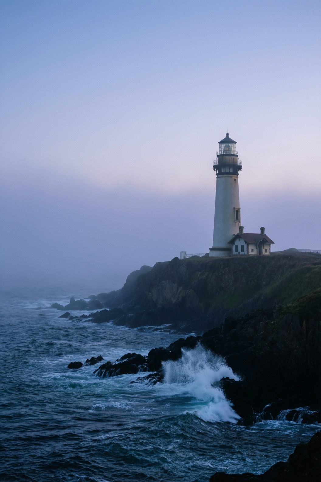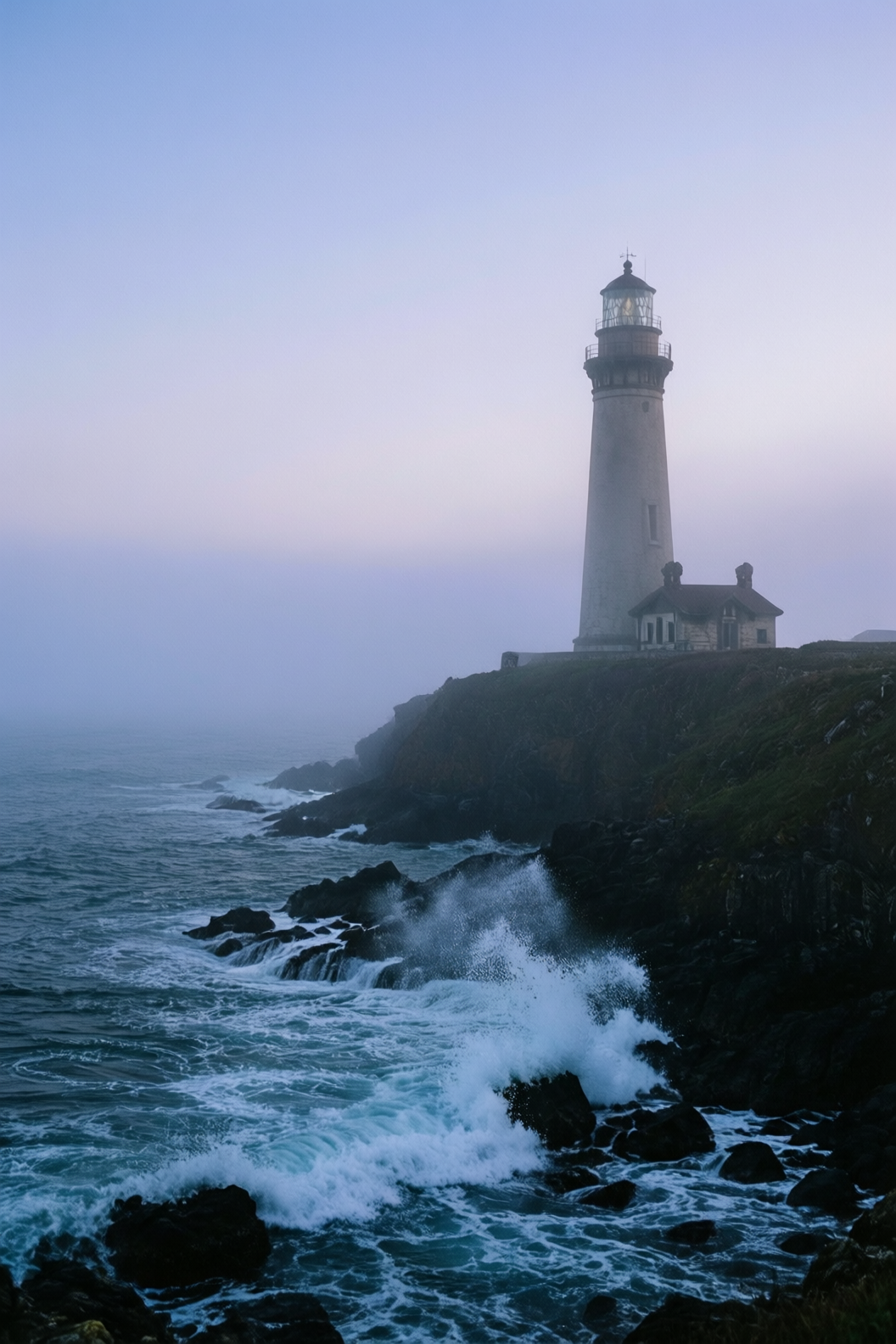 | At dawn, a thin mist veils the sea. An ancient stone lighthouse stands at the cliff’s edge, its beacon faintly visible through the fog. Black rocks are pounded by waves, sending up bursts of white spray. The sky glows in soft blue-purple hues under cool, hazy light—evoking solitude and solemn grandeur. |